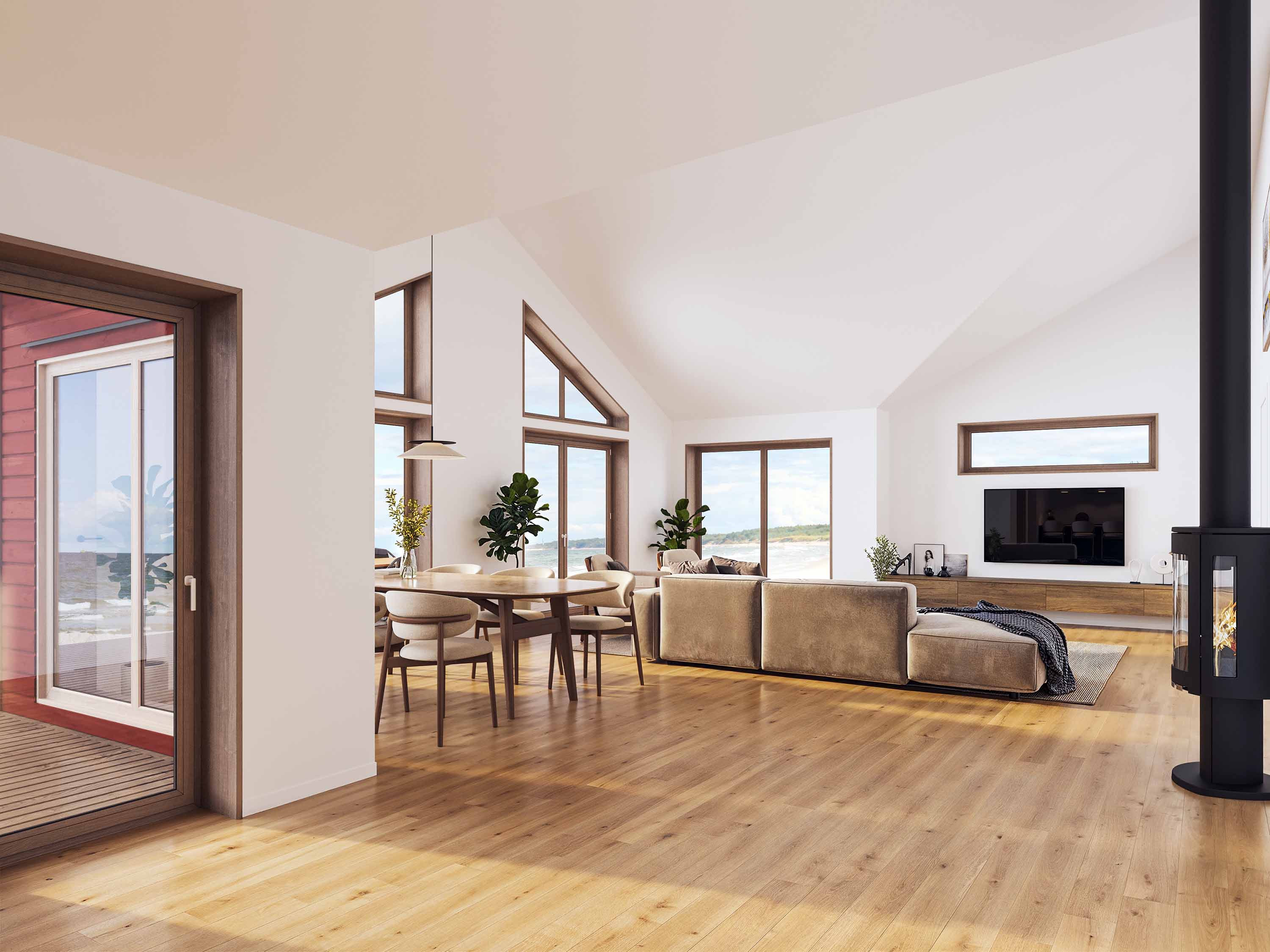 Stuen spiller sammen med køkkenet en central og fremtrædende rolle i oplevelsen af en ekstremt åben og lys planløsning - perfekt til spisning og socialt samvær.
