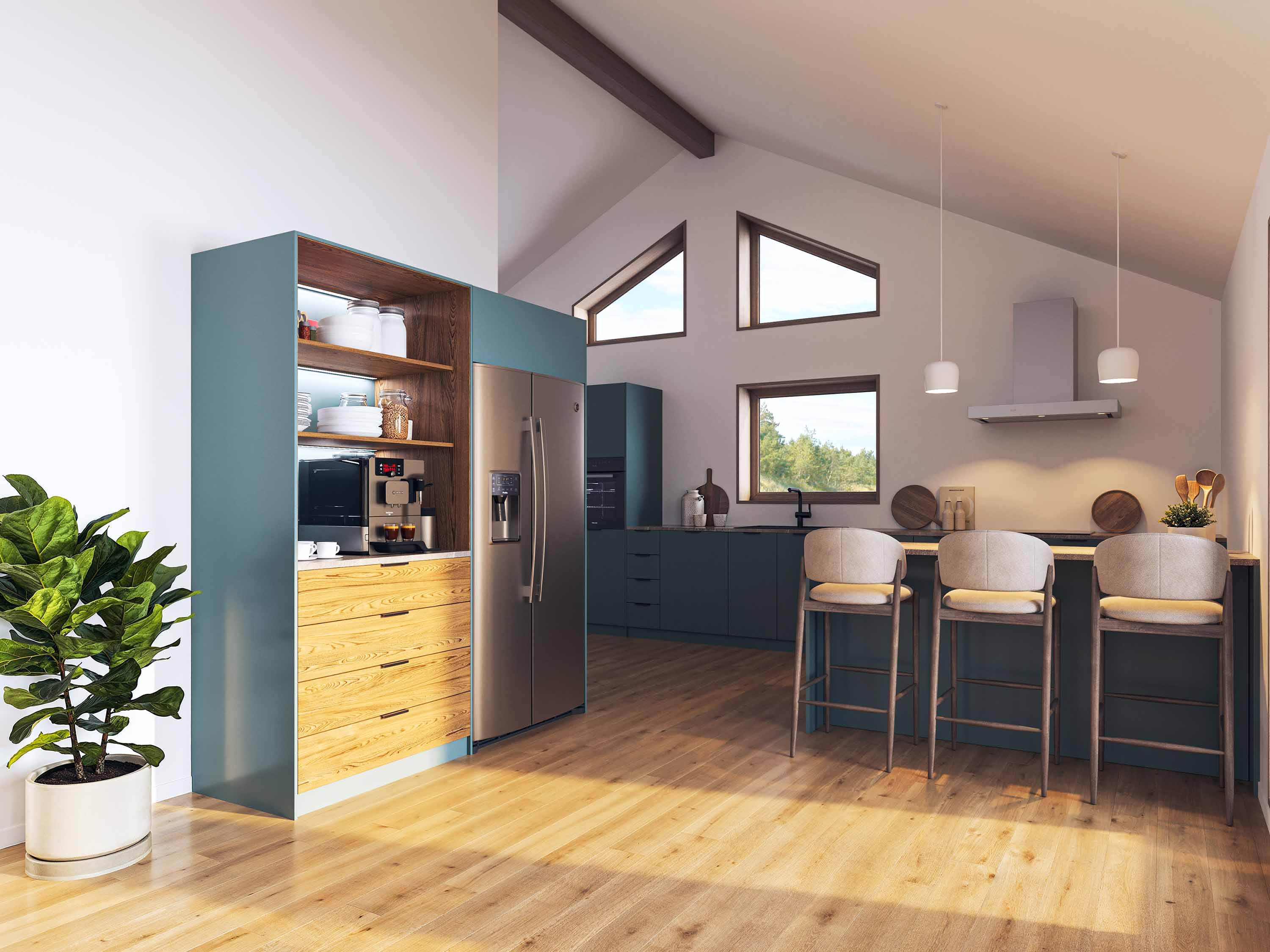 Olohuoneella ja keittiöllä on keskeinen ja näkyvä rooli erittäin avoimen ja valoisan pohjaratkaisun kokemuksessa - täydellinen ruokailuun ja seurusteluun.